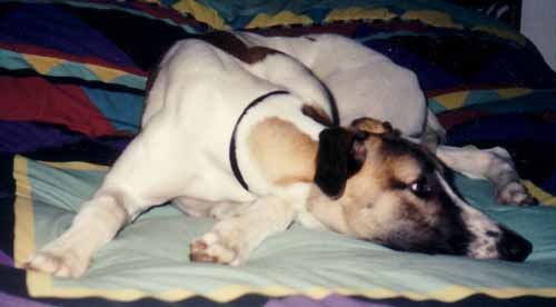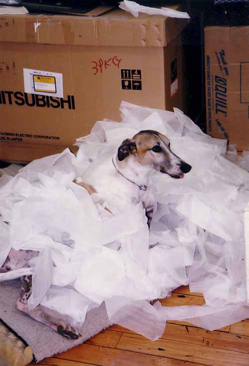 Happy's life pretty much paralleled that of Dendritics as a production company. He was born May 24, 1992. Joined us in September 92 as a rare greyhound puppy aged only 15 weeks. Celebrated his 10th birthday in May 2002 and died July 28, 2002. He was a major force in our interviewing process, passing judgment on one and all without concern for political correctness. You had to at least think he was OK, or how could you survive? Irina and her daughter were initially terrified of dogs, but he won them over with his sweet side.